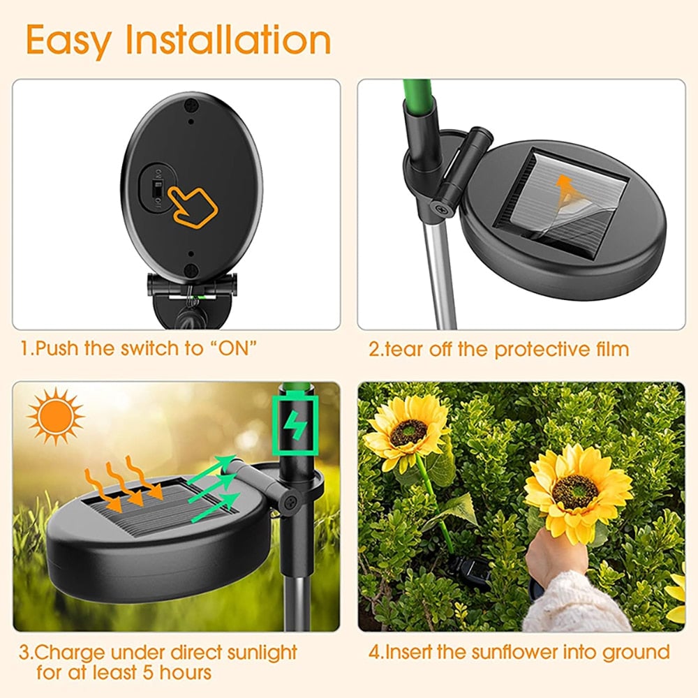 ⭐A perfect addition to any garden, courtyard, walkway, balcony, an entry way to a house, or even for use around a pool, the solar sunflower lights are sure to give your yard or garden extremely cool look, and will be an instant conversation piece for whoever lays eyes upon them!